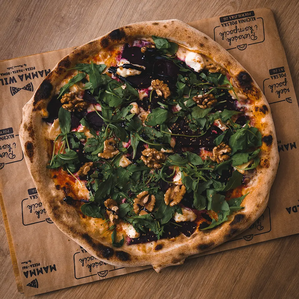 Pizza Barbabietola to propozycja, która łączy wyraziste nuty ziemistego buraka z kremowością sera koziego i świeżością rukoli. Intensywny kolor i pełnia smaku sprawiają, że to jedna z najbardziej charakterystycznych pozycji w menu — nowoczesna, elegancka i wciąż w 100% włoska.