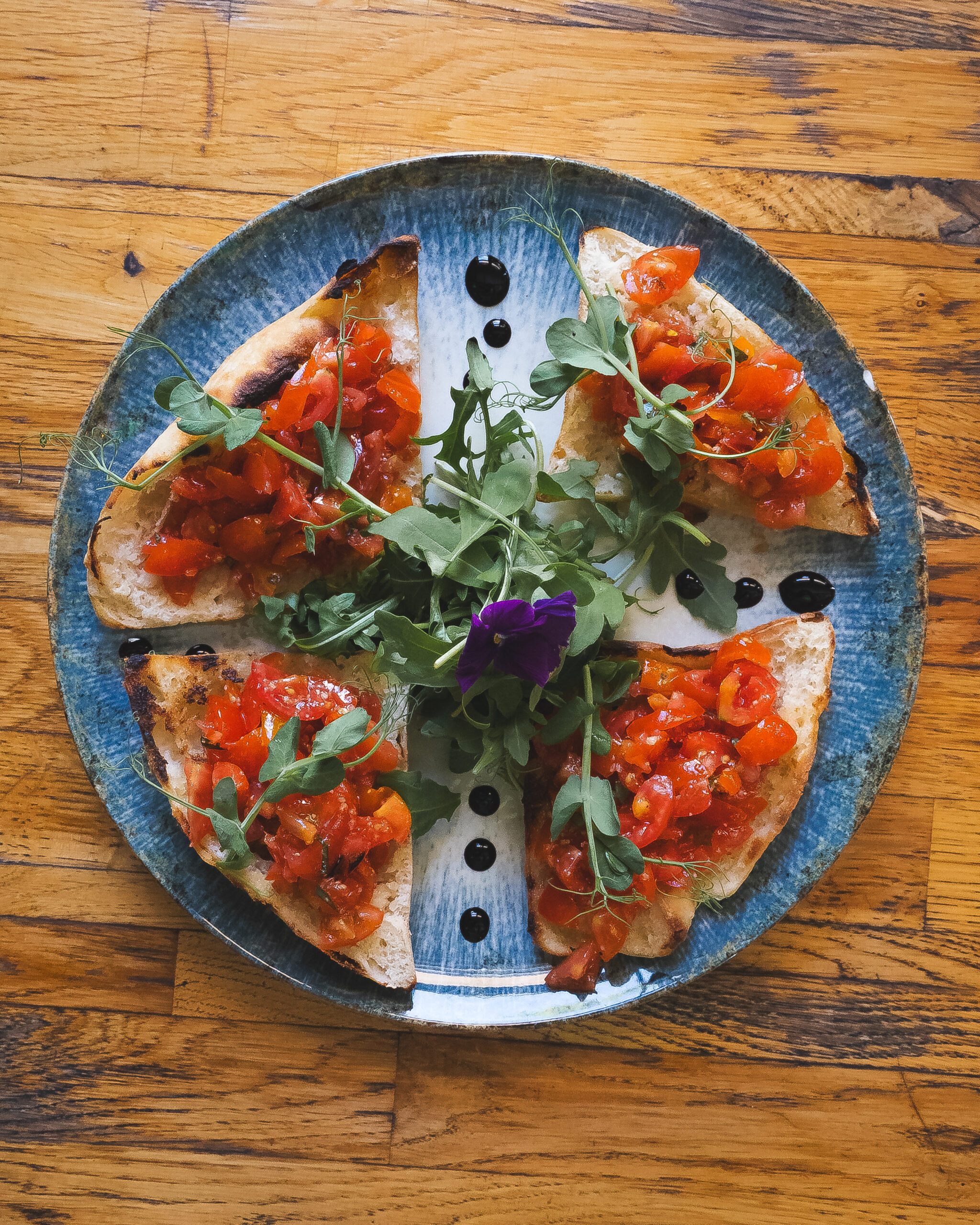 Na pieczywie zapiekanym lub delikatnie grillowanym układane są pomidorki koktajlowe, które wcześniej marynowane są z czosnkiem, świeżą bazylią i oliwą z oliwek. Całość tworzy kompozycję o intensywnym, śródziemnomorskim aromacie i naturalnej słodyczy pomidorów.